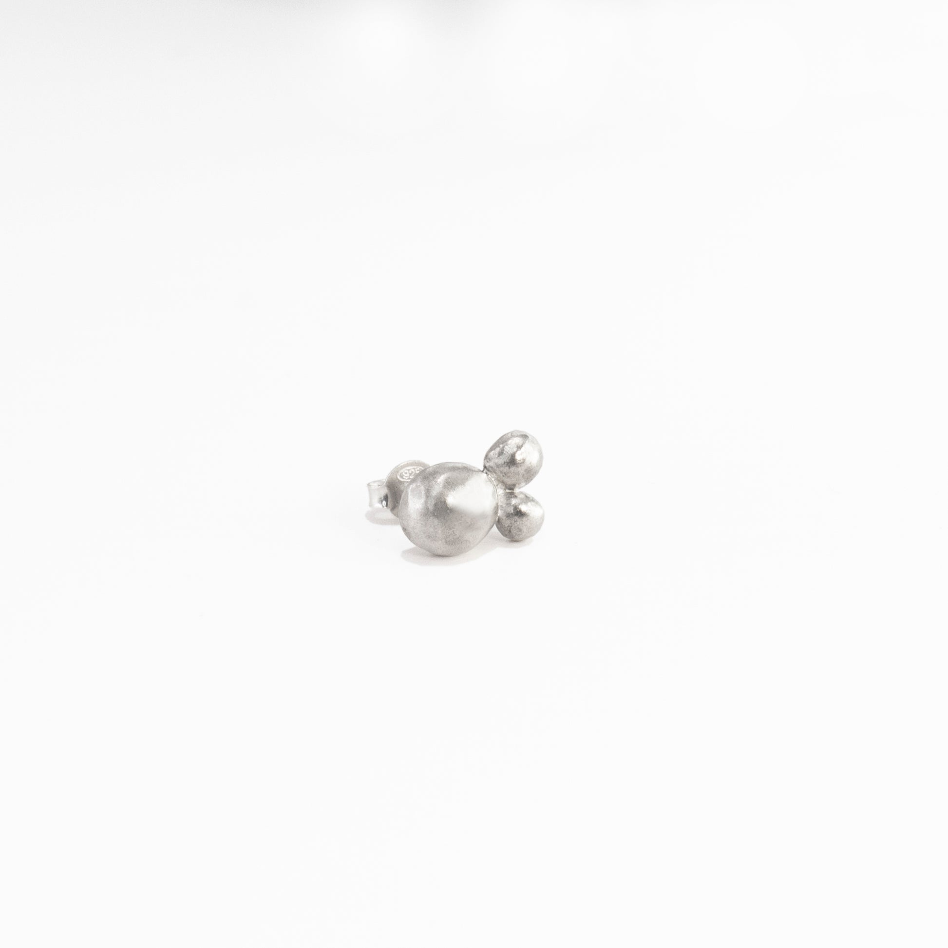 The mickey stud brings a playful twist to sculptural minimalism. Its name comes from the way the trio of rounded volumes loosely echoes an upside-down Mickey-like silhouette. Hand-crafted in sterling silver, it feels both graphic and soft, turning simple shapes into a tiny wearable sculpture.