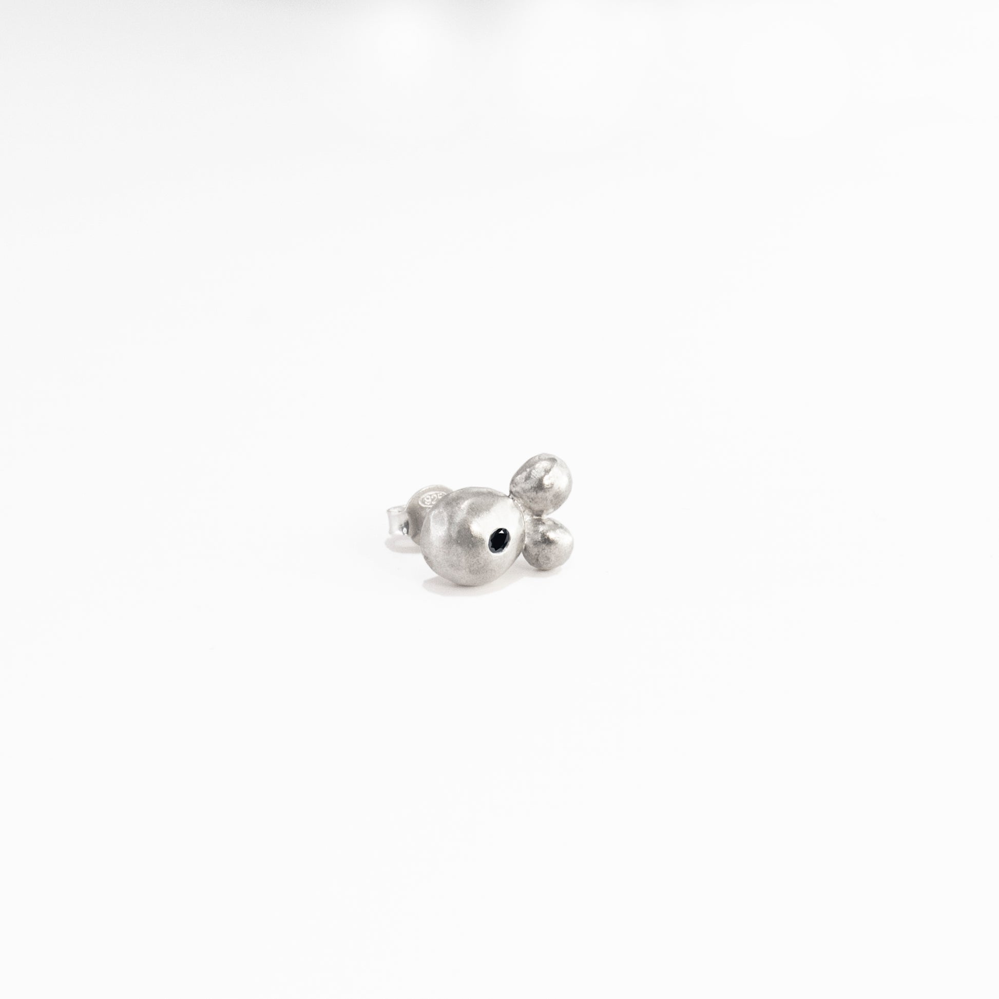 The mickey stud black diamond brings a playful twist to sculptural minimalism. Its name comes from the way the trio of rounded volumes loosely echoes an upside-down Mickey-like silhouette. This version features a 1.8 mm brilliant-cut black diamond set into the top sphere, adding a sharp, dark sparkle that elevates the piece’s cool, artful character.