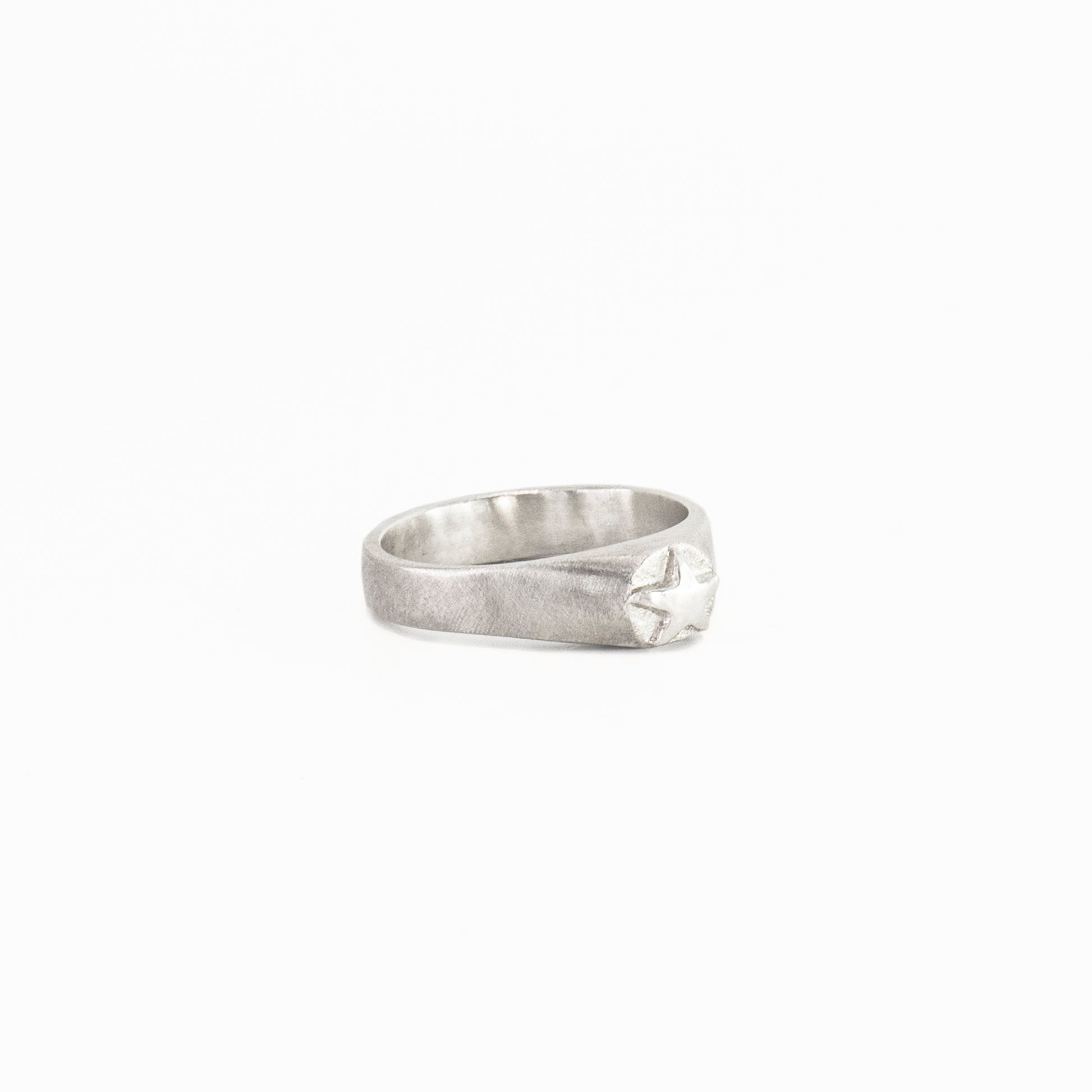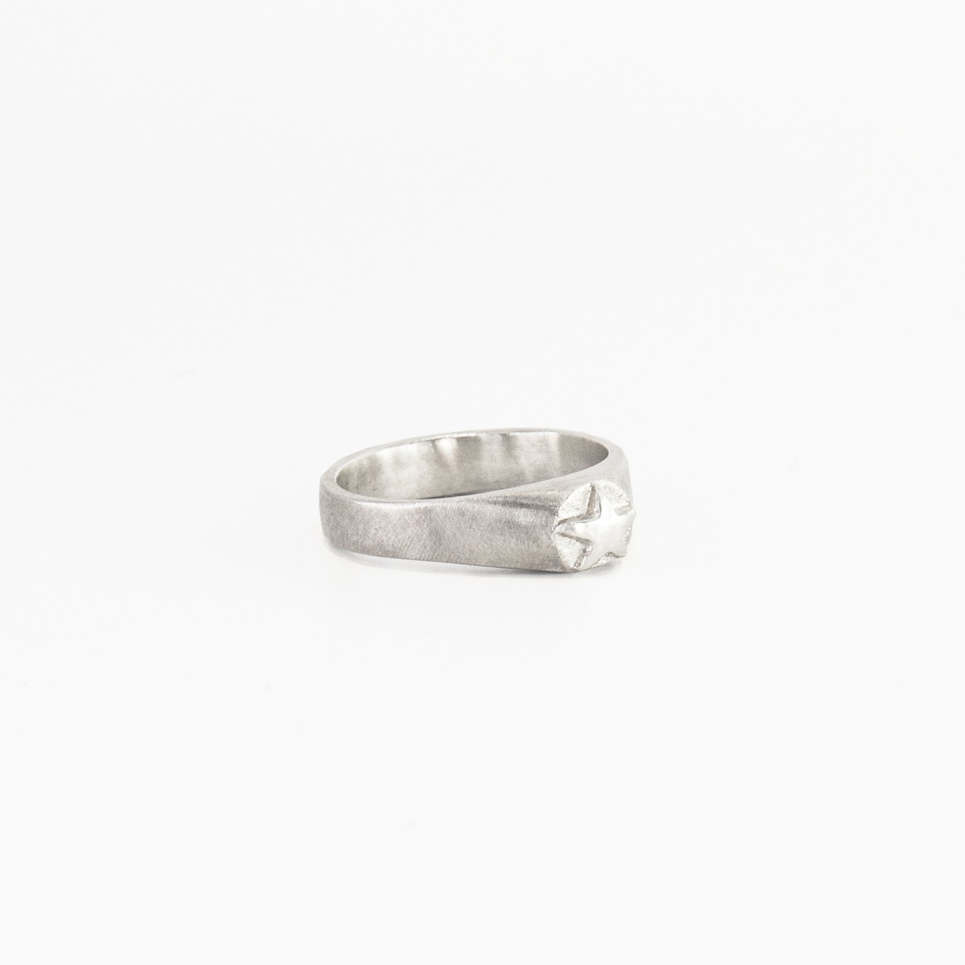 The mini star signet blends feminine elegance with effortless cool. Hand-crafted in sterling silver, it features a petite, sculptural star set on a slim, tapered band. Its brushed finish creates a soft, modern texture, while the polished star adds a refined yet edgy shine.