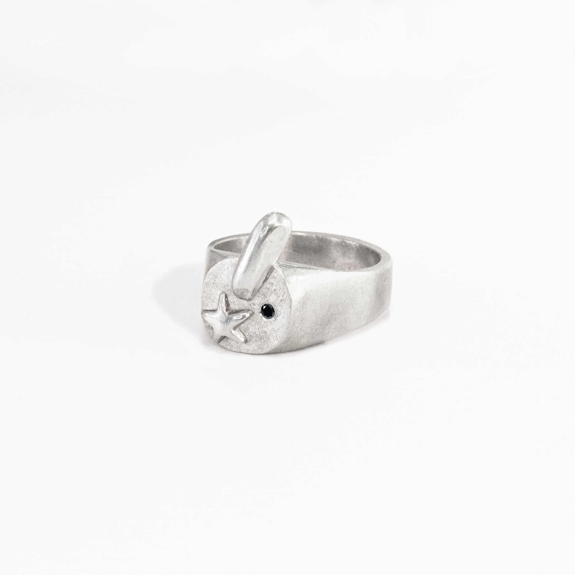 The shooting star signet fuses artful abstraction with celestial symbolism. Hand-crafted in sterling silver, it features a deconstructed star form paired with a sweeping sculptural arc.The brushed texture softens the bold silhouette, featuring a brilliant cut black diamond adding sharp contrast and a hint of mystery.