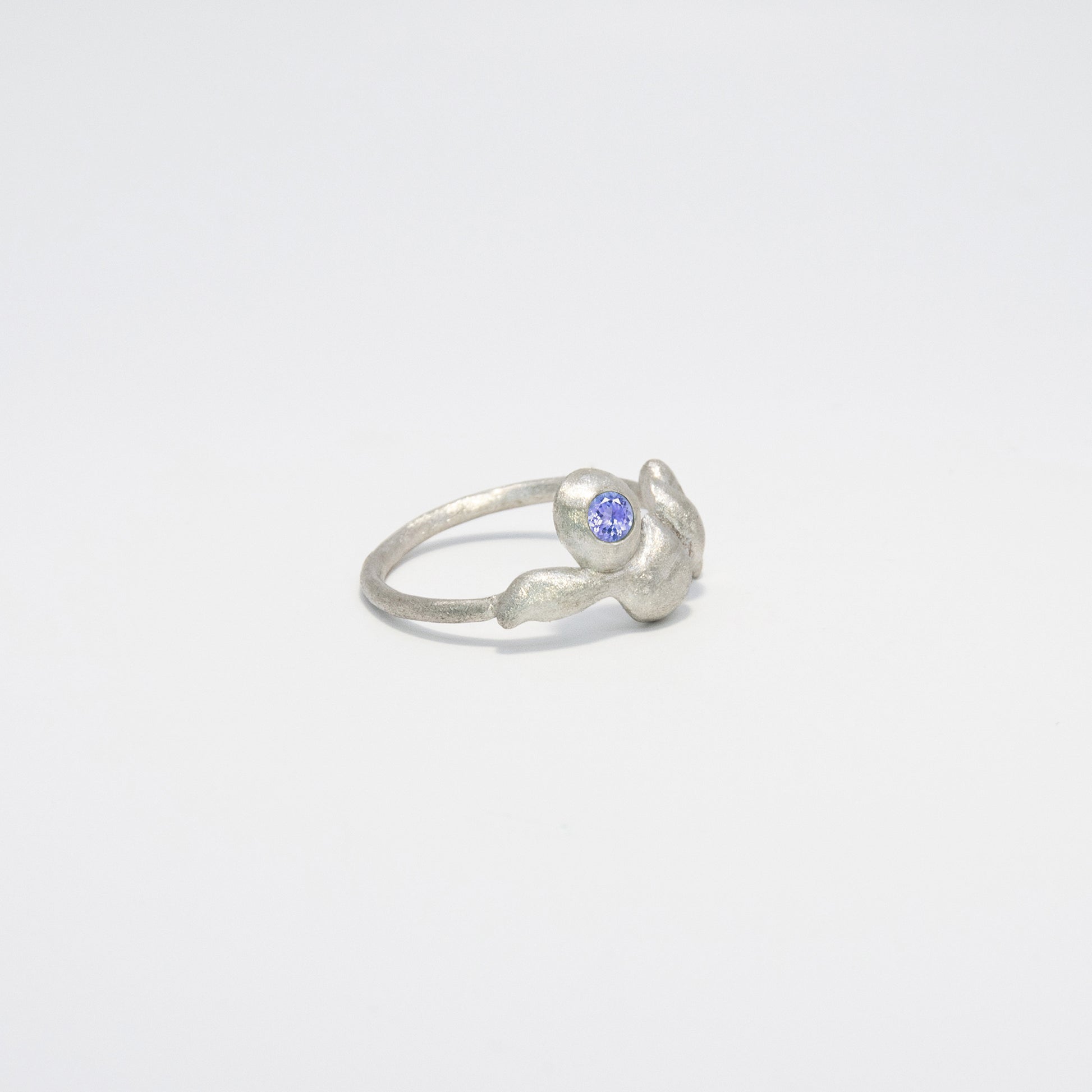 A delicate and elegant ring formed of dancing bobbly shapes, set with a brilliant cut tanzanite